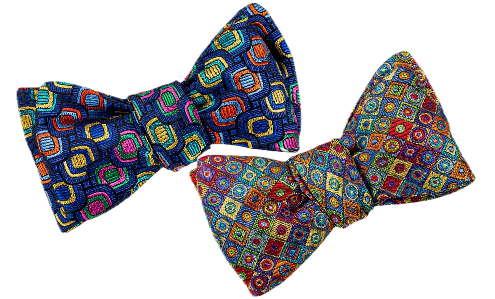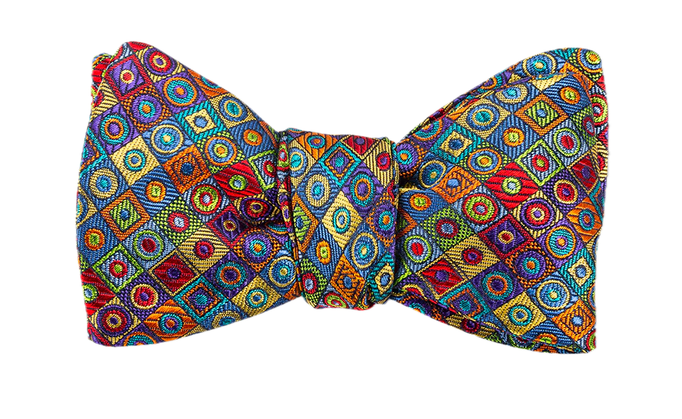 Bright hues of red, green, orange, gold and blue highlight this geometric woven bowtie in classic 2 1/2 inch butterfly shape.  These handmade bow ties easily make a relaxed, classic knot and are built for long-lasting shape and enjoyment.  The butterfly shape is distinguished by its broad, flared ends that create a classic silhouette.