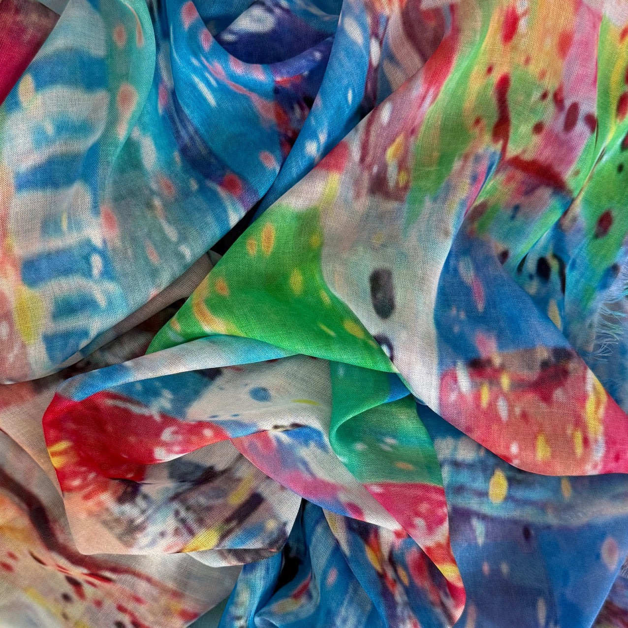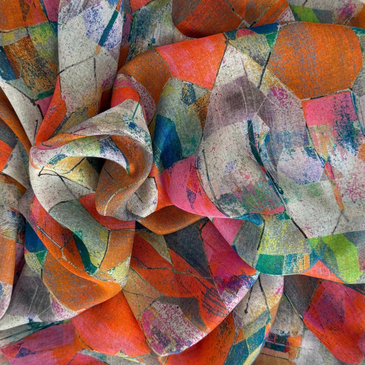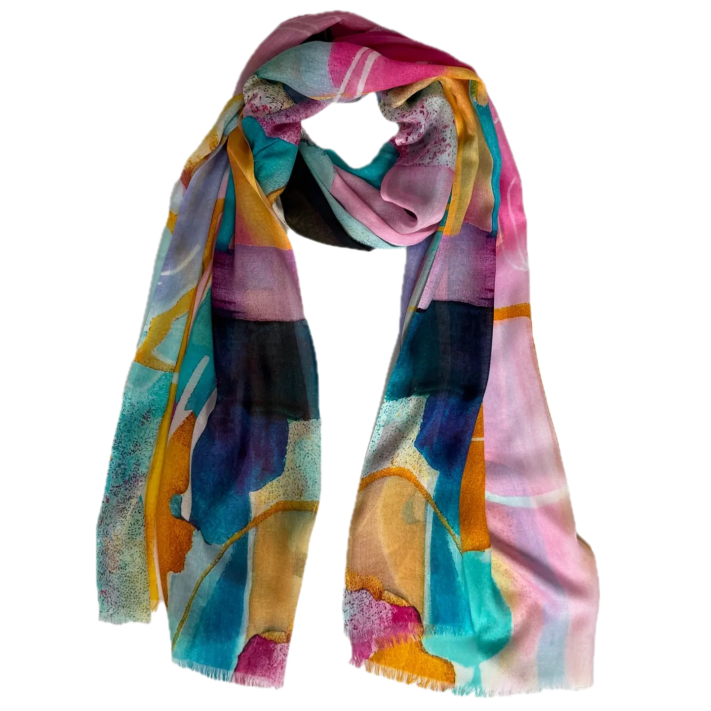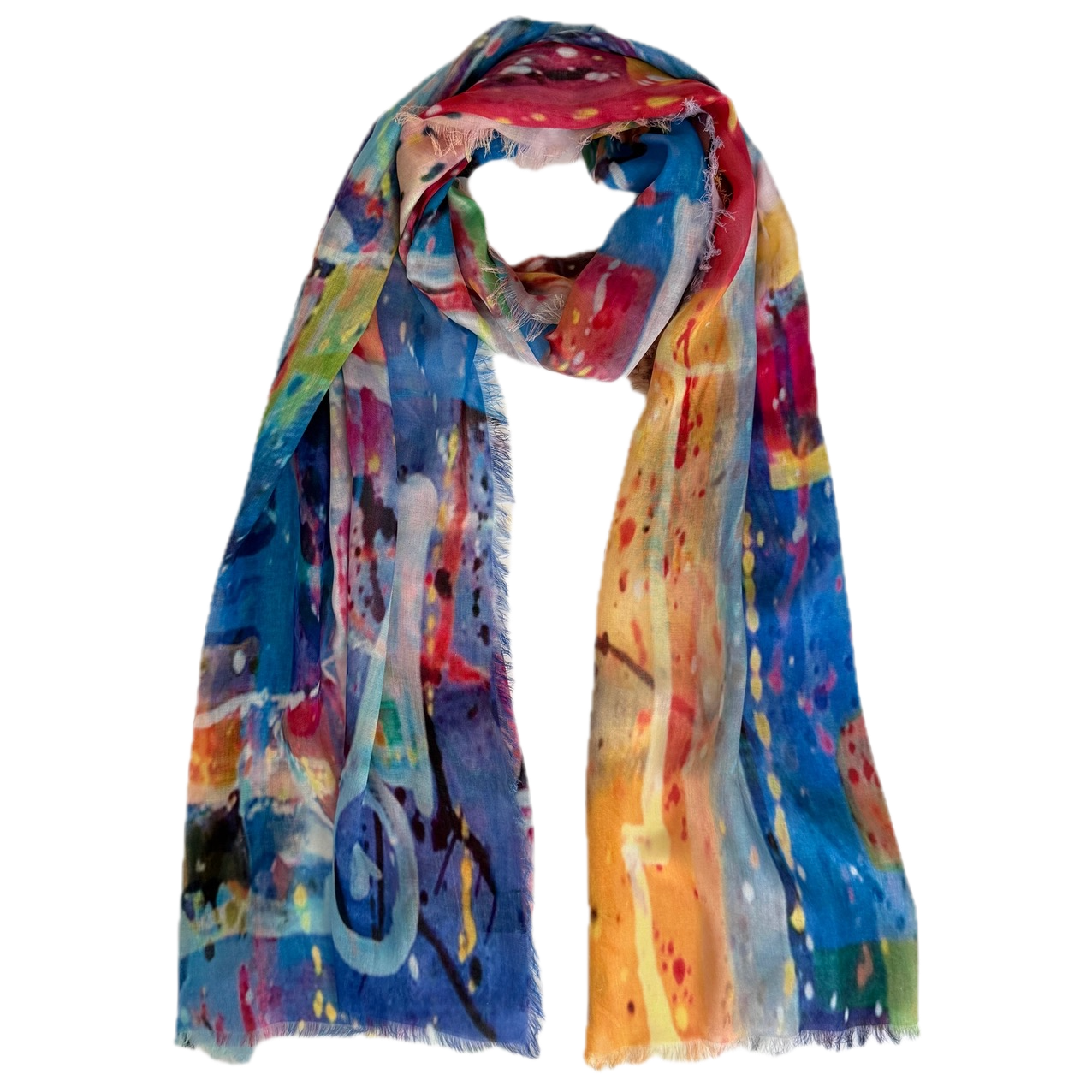 These sophisticated multicolored abstract scarves are crafted from sumptuous 100% Modal fabric draping beautifully while remaining remarkably lightweight. The digitally printed designs feature artful interplays of color that transition seamlessly from casual to formal settings. Finished with delicate eyelash fringe on all four sides, this 80" x 27" statement piece invites you to express your distinctive style. Hand wash or dry clean.