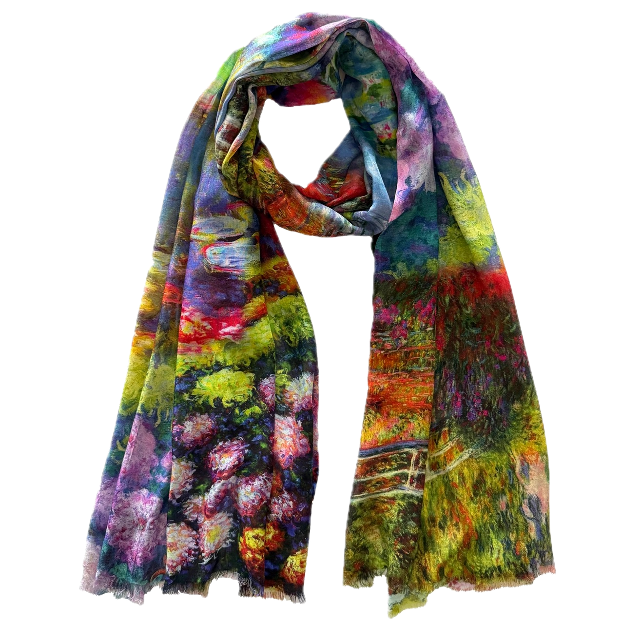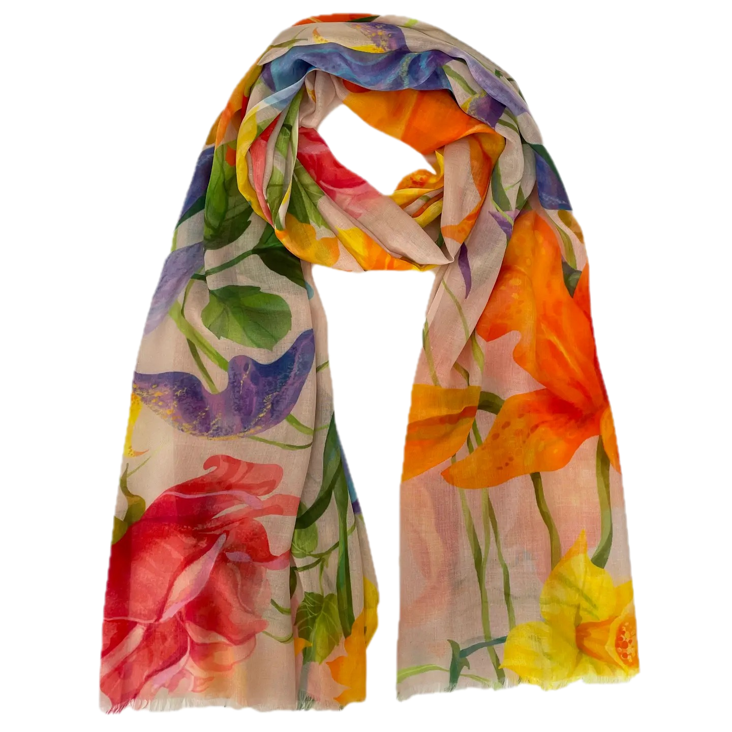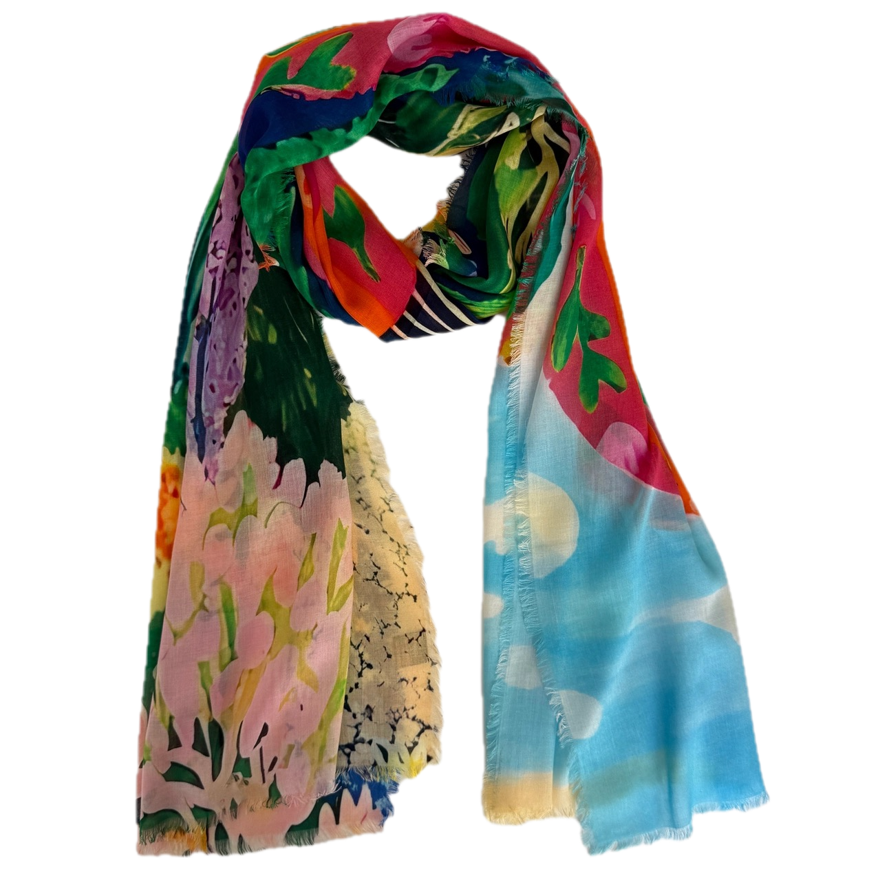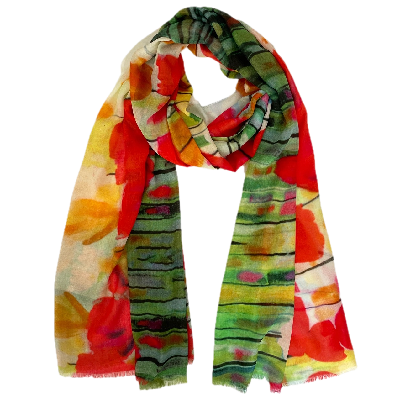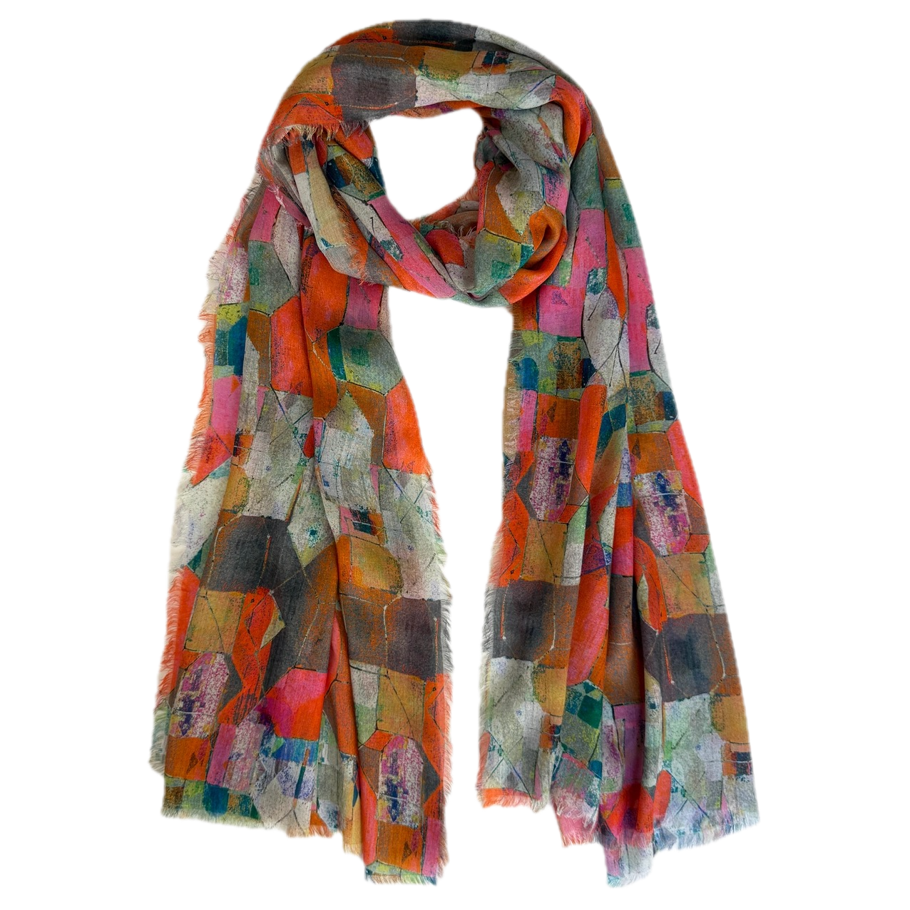 These sophisticated multicolored abstract scarves are crafted from sumptuous 100% Modal fabric draping beautifully while remaining remarkably lightweight. The digitally printed designs feature artful interplays of color that transition seamlessly from casual to formal settings. Finished with delicate eyelash fringe on all four sides, this 80" x 27" statement piece invites you to express your distinctive style. Hand wash or dry clean.