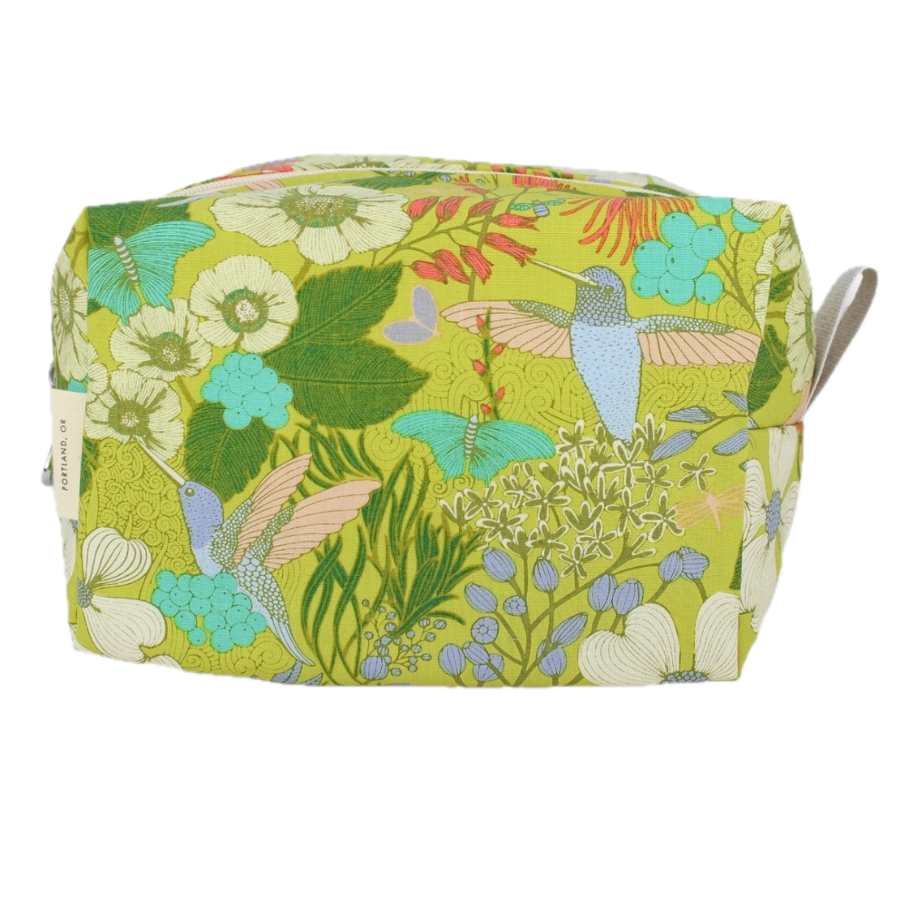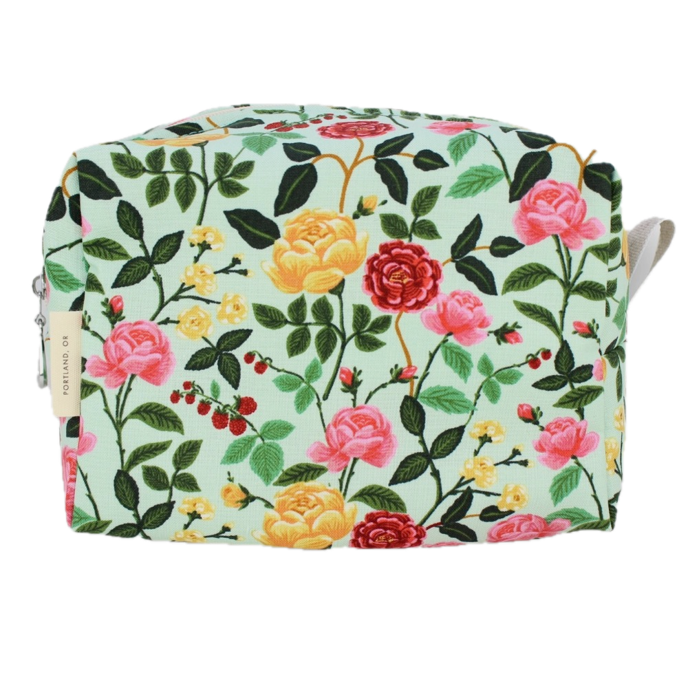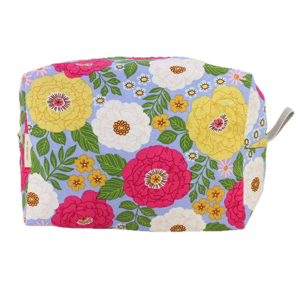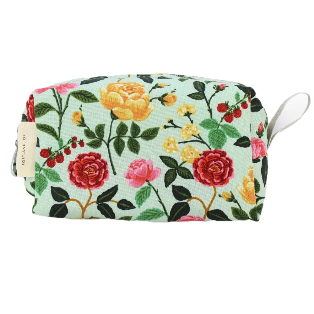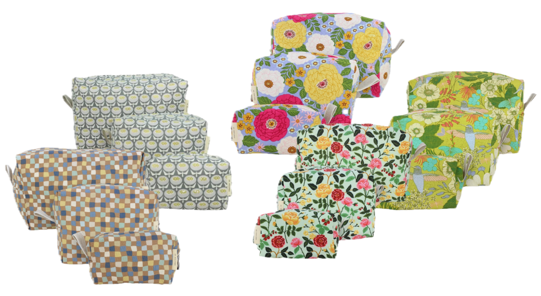 Stay organized on-the-go with these darling Dopp Kits! Size small, 5" x 2.5", medium, 7" x 3.5", or large, 9" x 4.5" plastic lined bags feature zip closure in cute cotton prints. Coordinating coin purse and brush bag are also available. Spot clean outside and easily wipe the plastic lining inside.