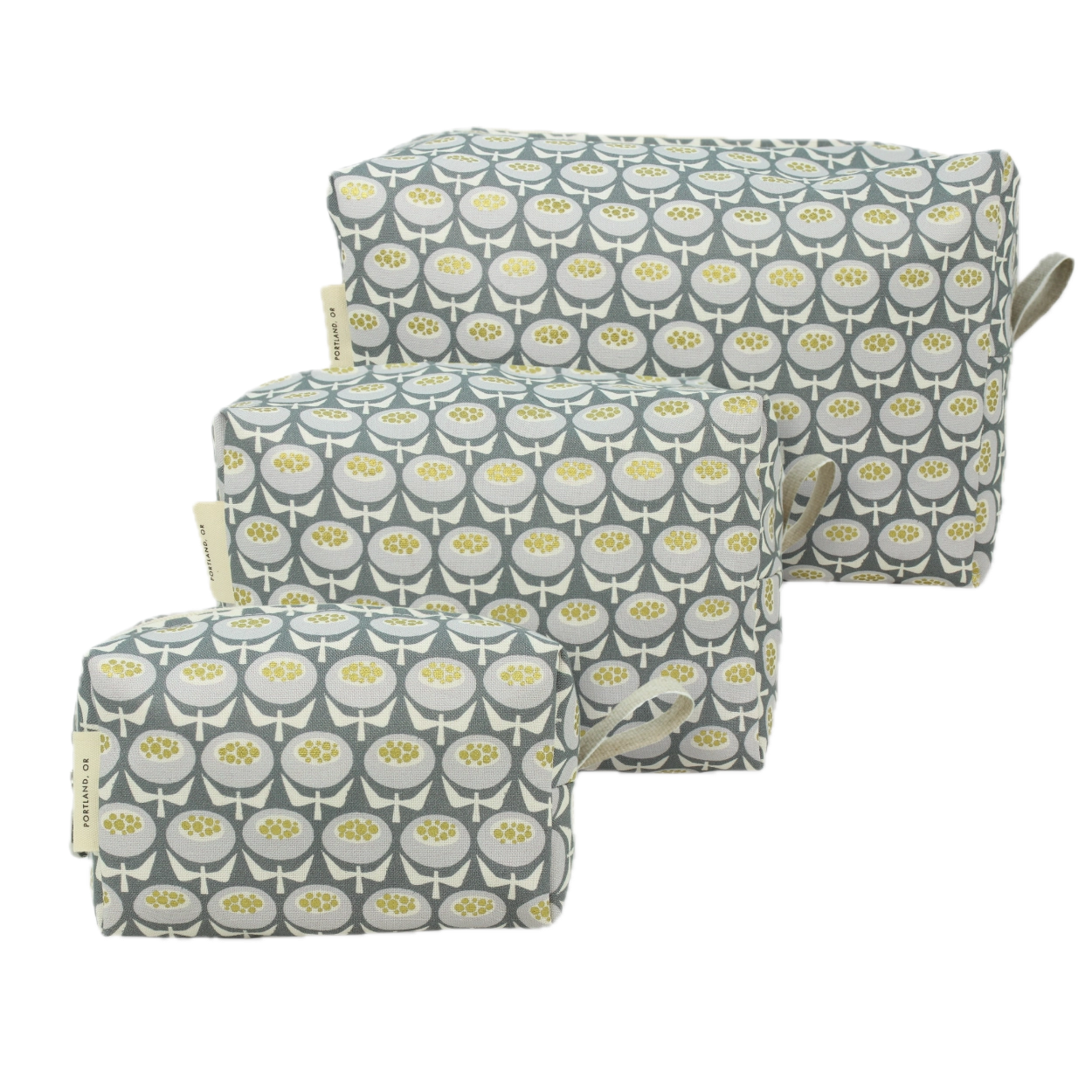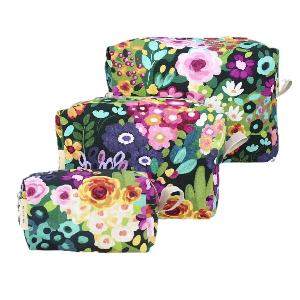 Stay organized on-the-go with these darling Dopp Kits! Size small, 5" x 2.5", medium, 7" x 3.5", or large, 9" x 4.5" plastic lined bags feature zip closure in cute cotton prints. Coordinating coin purse and brush bag are also available. Spot clean outside and easily wipe the plastic lining inside.