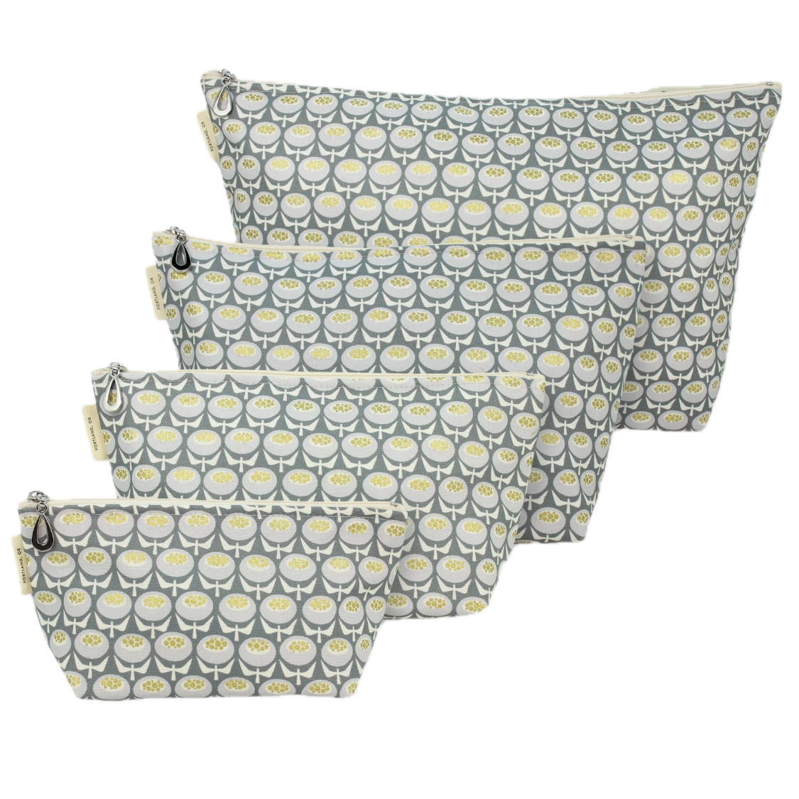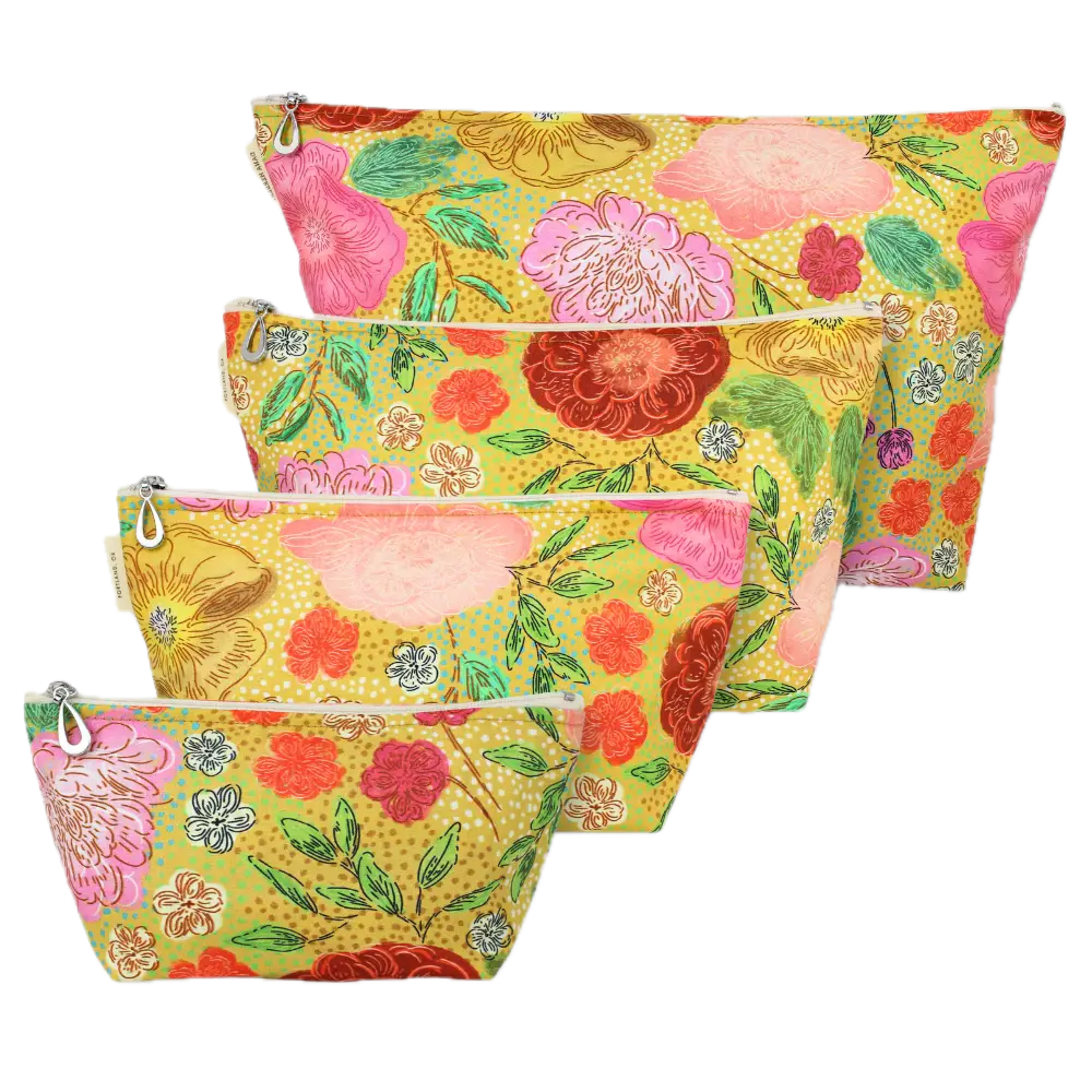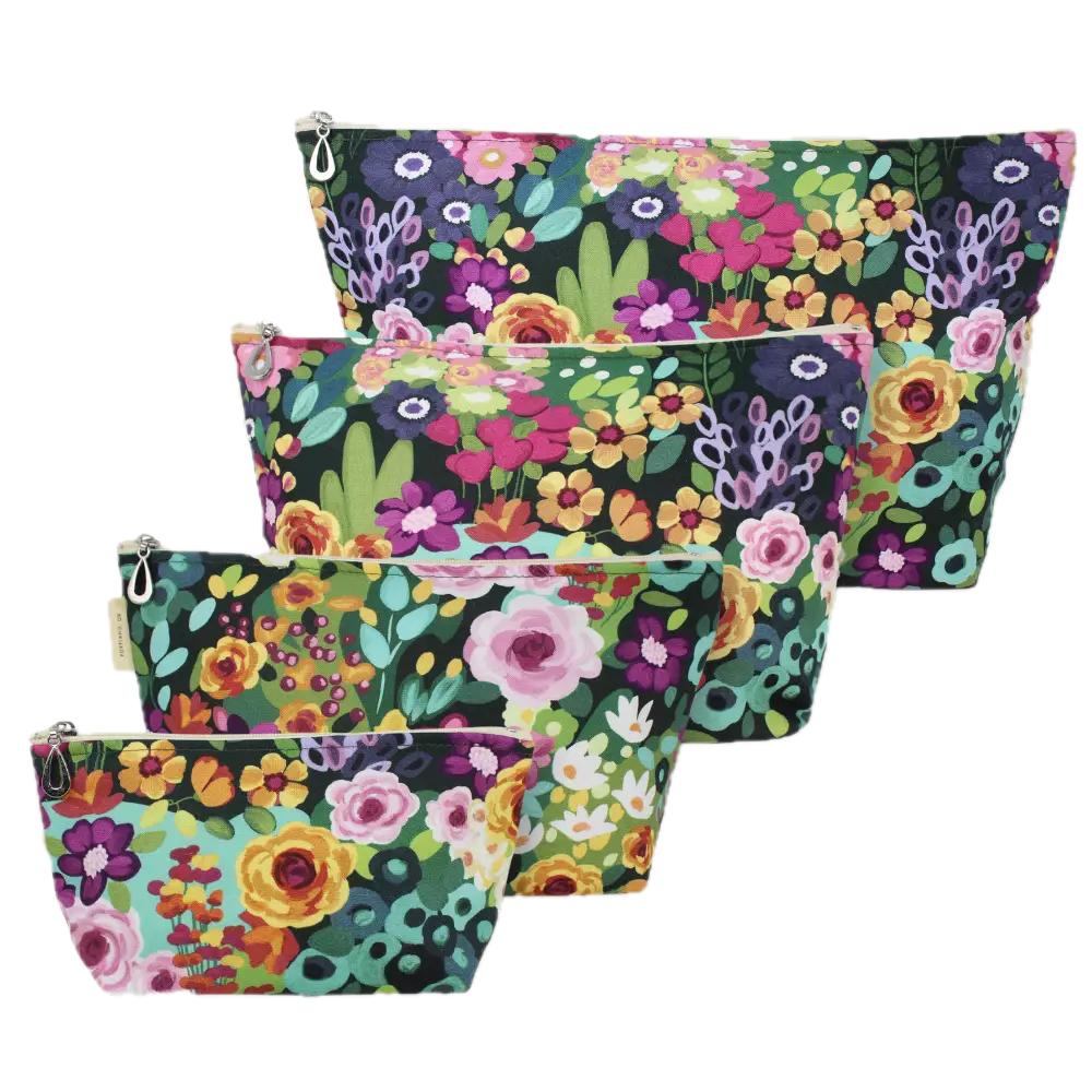 Made with a durable cotton exterior and a plastic lining for easy cleaning, these makeup bags are perfect for all your cosmetic storage needs.  Four sizes accommodate a variety of products: x-large, 8.5" x 13, large, 6" x 10", medium, 5" x 9",  and small, 4" x 7". Nest together for compact storage or easy access to small items.