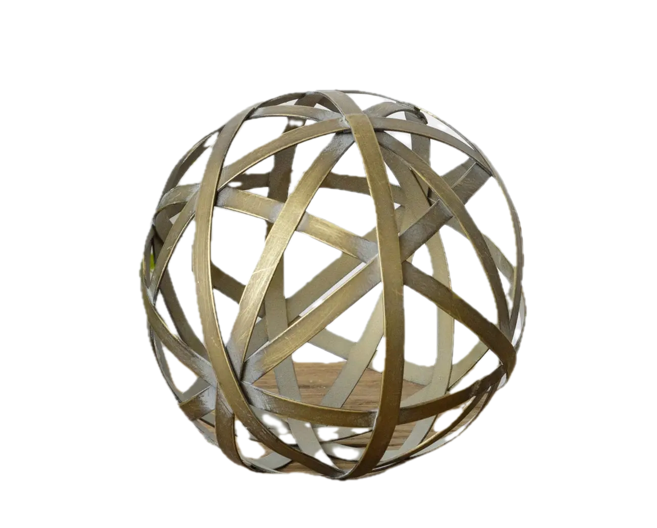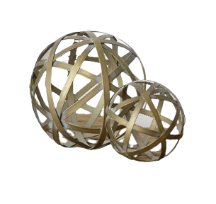 Narrow bands of brass criss cross to form open, airy decorative spheres. Nestle together in a bowl or group varying sizes on a shelf or side board, these are the perfect addition to any table scape.
