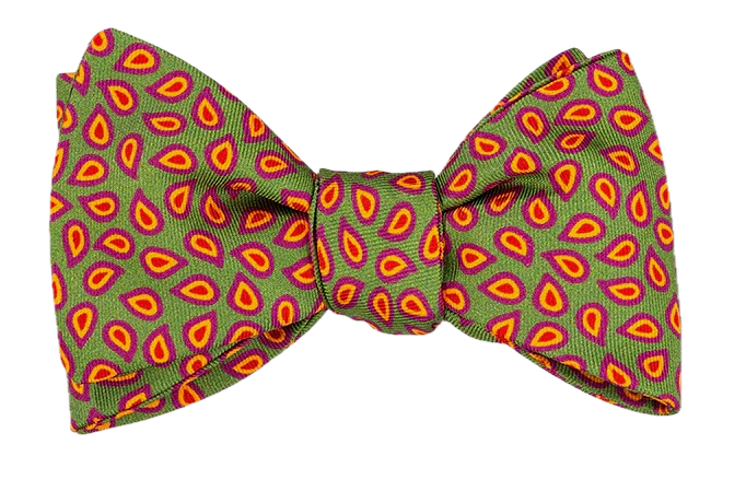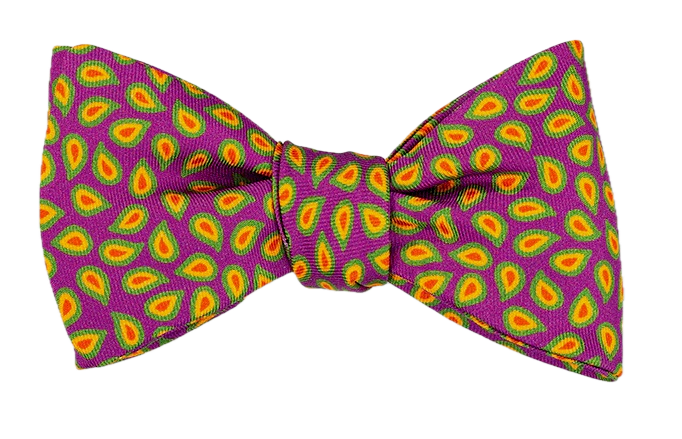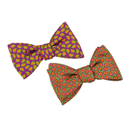 Mini paisley patterns dot these brightly colored silk bow ties. These handmade bow ties easily make a relaxed, classic knot and are built for long-lasting shape and enjoyment. A metal slider ensures a perfect fit, from 15 1/2 to 18 inches, while the metal hook allows the tie to be removed and reworn without tying and untying each time. The 2 1/2 inch butterfly shape is distinguished by its broad, flared ends that create a classic silhouette, the 2 1/4 inch classic cut has a more trim profile. 100% Silk.