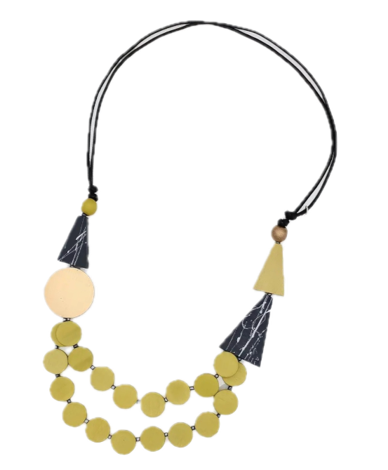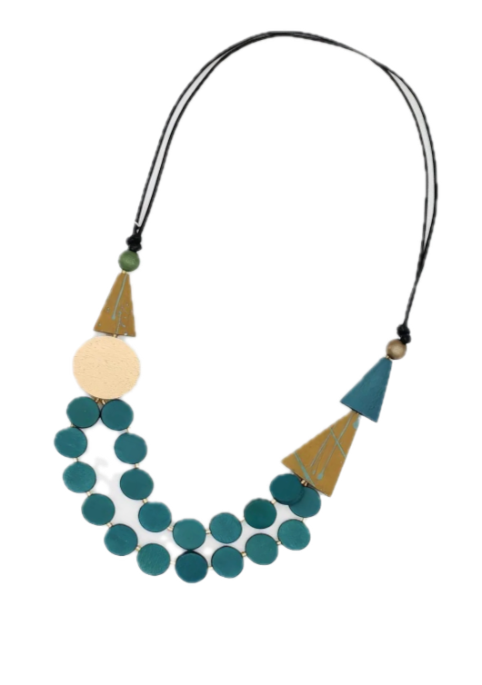 Geometric wooden beads are arranged to create dimensional depth and visual richness, while the adjustable wax cord (22-36") offers personalized styling flexibility. A blend of earthy tones and metallic accents delivers contemporary artisan appeal.